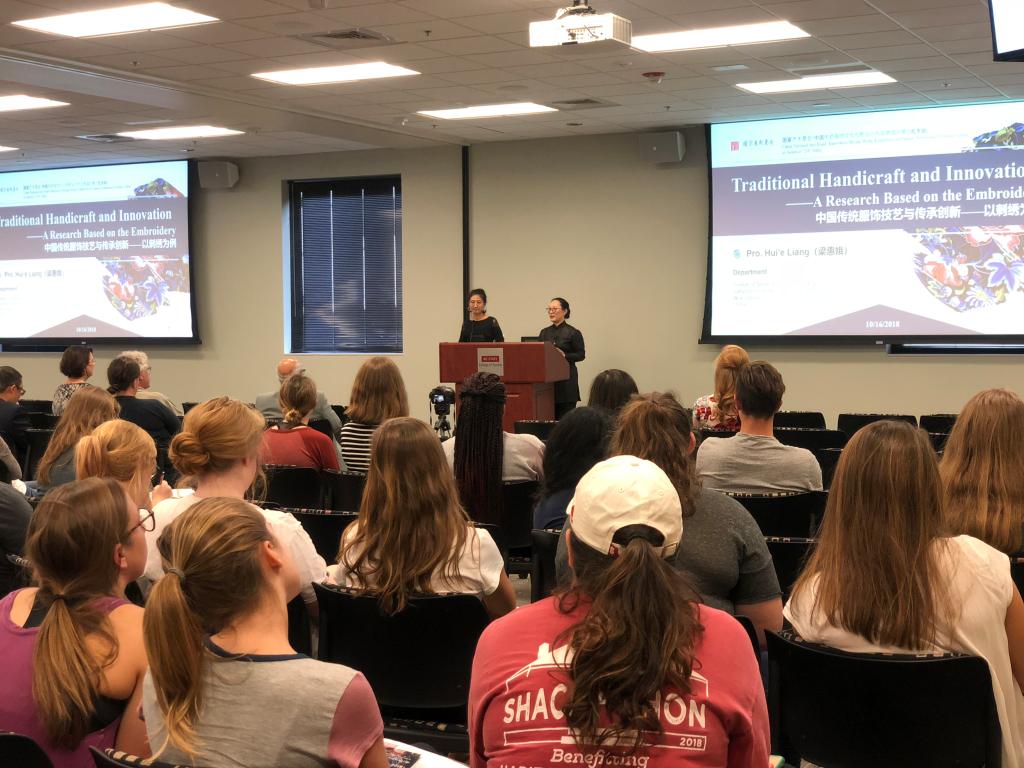 服装设计团队“2014年北京APEC会议领导人服装设计作品”在内的七十余件展品。学术报告以“中国传统服饰技艺和传承(Traditional Handicraft and Innovation)”为主题,项目负责人梁惠娥教授同在场的嘉宾与师生分享了中国传统服饰技艺种类,以刺绣为例,详细介绍了手工技艺制作方法、风格特征及文化意涵,并结合当下全球发展趋势,展示创新设计应用作品,就日后传统技艺传承提出了新的观点。主题演讲中,在场师生反响热烈,不少师生对其中的刺绣技法展现出浓厚的兴趣。