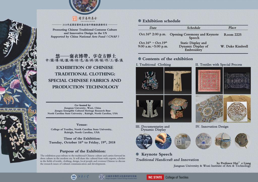 组织实施,纺织服装学院服饰文化研究团队、江苏省非物质文化遗产研究基地主办。此次北卡罗莱纳州立大学站海外巡展以中国传统特色面料与工艺为主要内容,本着“传播中华传统服饰文化,促进服饰遗产创新应用”主旨,通过实物展示、传统技艺视频播放、文字图片平面展示、刺绣技艺体验以及主题演讲,展现中国传统服饰技艺的博大精深。同时,借由中国传统服饰技艺的创新应用设计,丰富传统手工技艺应用新方法,赋予传统手工技艺新活力。实物展示包含在线赌博app