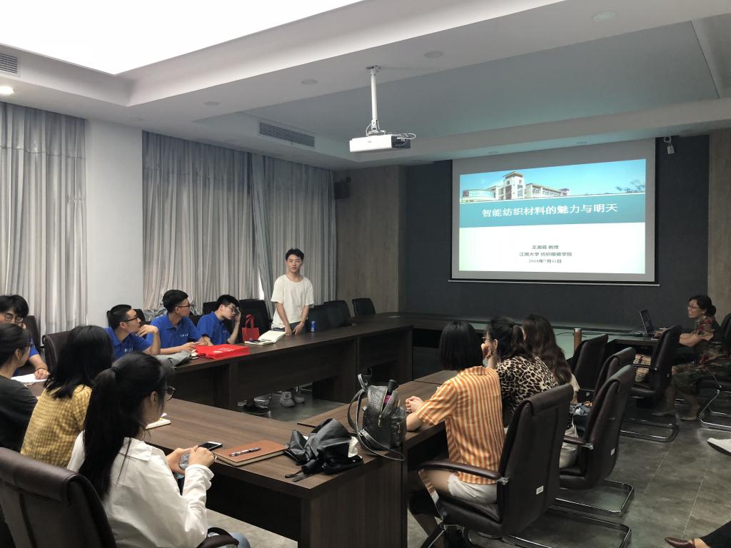 纺织服装学院副院长潘如如老师致欢迎辞,对来自四川大学、西南大学、东北师范大学、太原理工大学等参营同学表示热烈的欢迎,同时潘老师对学院的学科情况、科研组织机构、科研工作、社会服务、研究生招生规模和人才培养质量等进行了介绍。随后学院研会志愿者带领参营同学参观学院省(部)级科研平台,包括针织技术教育部工程研究中心、生态纺织教育部重点实验室、江苏省功能纺织品工程技术研究中心和江苏省数字喷墨印花工程技术研究中心等,各科研平台负责老师对其科研情况、服务情况以及研究方向等做了详细介绍。下午学院博士生导师王潮霞教授给同学们作了有关纺织行业及其未来发展趋势方面的学术报告。