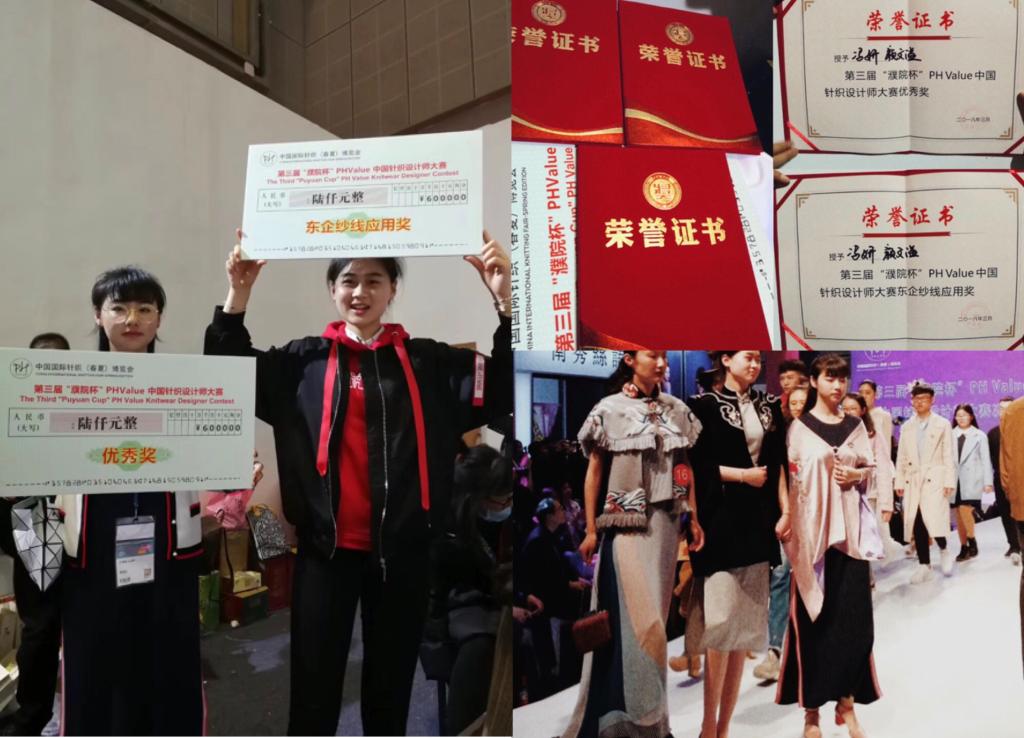纺织服装学学生冯妍、颜文溢的作品《初生·容和》经过了一番激烈角逐,喜获优秀奖和东企最佳纱线应用奖,并且获得了中国针织工业协会的官方认证中国针织设计师的称号与认证书。