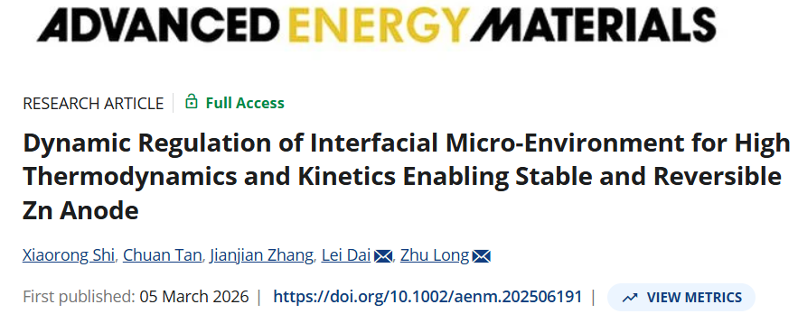 近日,我院短纤维功能材料研究室龙柱教授团队在水系锌离子电池领域取得了重要研究进展,研究成果以“Dynamic Regulation of Interfacial Micro-Environment for High Thermodynamics and Kinetics Enabling Stable and Reversible Zn Anode”为题在线发表在《Advanced Energy Materials》(IF=26,中科院大类一区TOP期刊)上,论文第一作者为我院博士研究生史肖蓉,通讯作者为龙柱教授和戴磊教授,在线赌博app