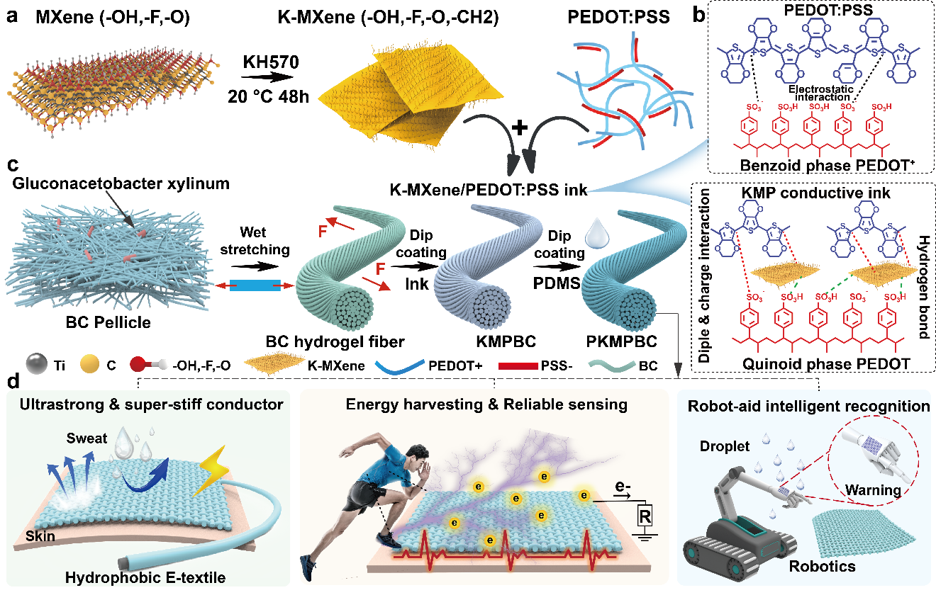图1展示了通过KH570改性MXene(K-MXene)构建稳定分散的导电墨水,并在取向BC纤维中实现均匀浸涂与界面结合,随后采用PDMS浸涂形成耐液体的核壳结构。得益于导电网络构筑-纤维取向增强-核壳结构保护的协同机制,纤维可被进一步织造为纺织电子器件,用于能量收集、自供能传感与智能液体识别与监测。