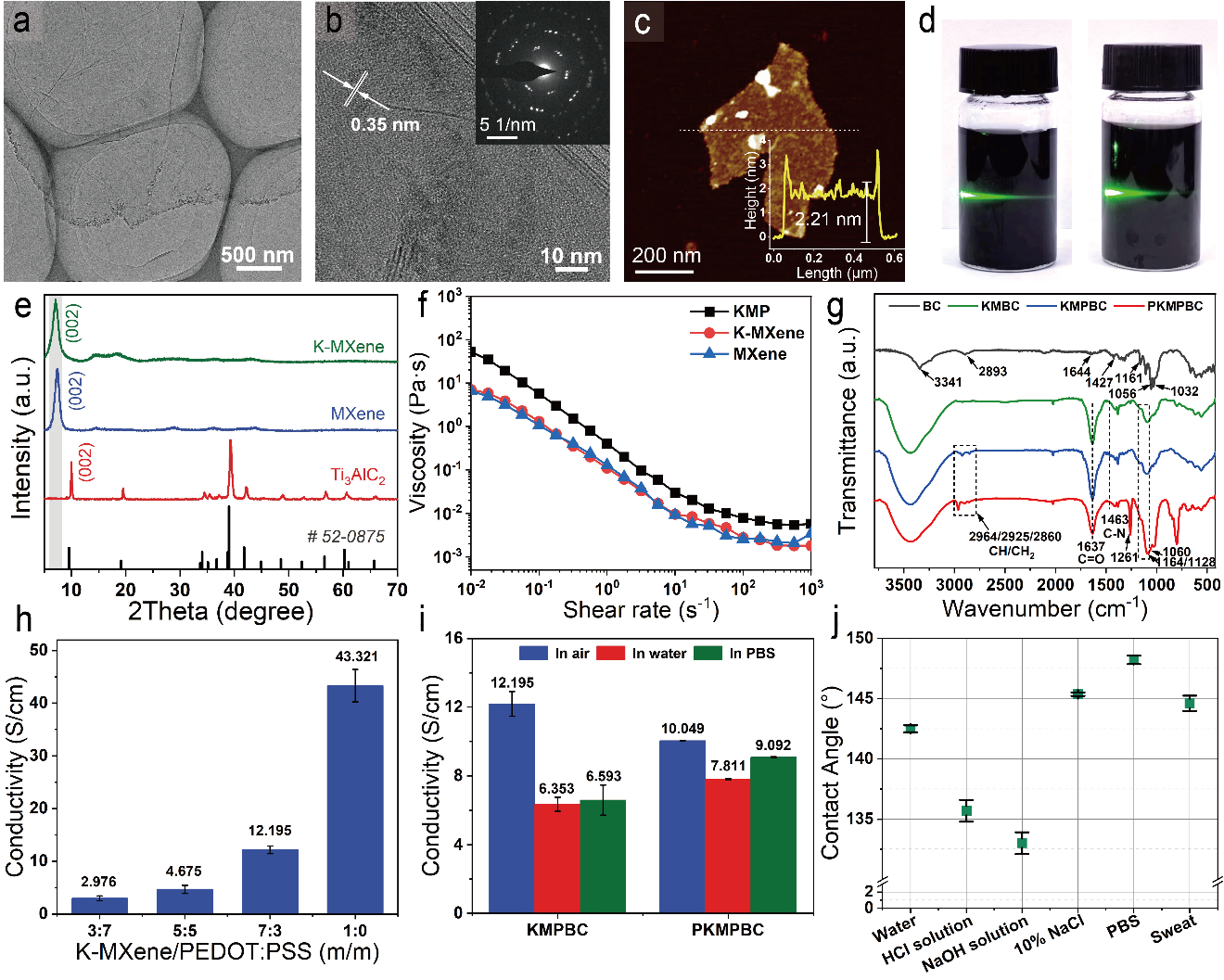 图2:K-MXene/PEDOT:PSS导电墨水与PKMPBC纤维的形貌与表面特性。