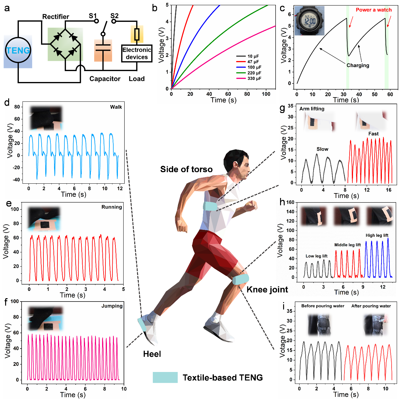 图5给出了纤维织入服装后的集成示例及人体运动信号采集结果。器件可对不同运动模式与幅度变化产生可区分的电学响应,实现对步行、跑步、跳跃等动作的实时监测;在液体环境扰动下仍能保持信号可读性,体现出其面向日常穿戴与复杂工况的应用潜力。