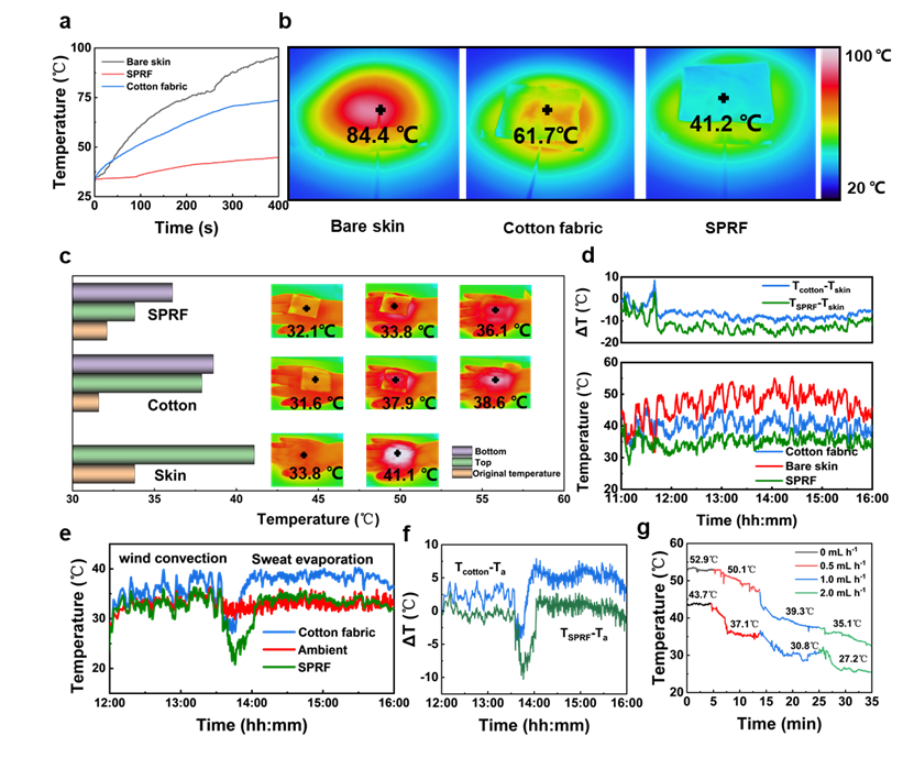 如图5所示,多级梯度结构织物具有良好的人体热管理性能,在实际皮肤测试中可以实现5℃的降温效果。此外,辐射冷却和蒸发冷却的协同可以实现9.2 °C的冷却效果。