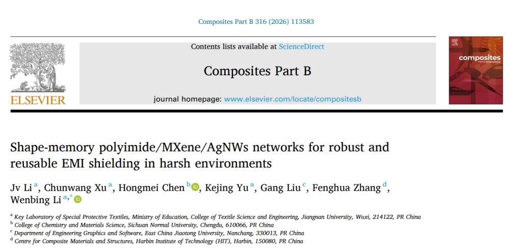 近日,我院先进纤维与纺织复合材料研究团队在复合材料领域顶级期刊《Composites Part B: Engineering》(IF=14.2)上发表题为“Shape-memory polyimide/MXene/AgNWs networks for robust and reusable EMI shielding in harsh environments”的研究论文。该研究提出了一种基于形状记忆聚酰亚胺(PI)的梯度导电网络构建策略,通过将二维MXene和一维银纳米线(AgNWs)组装到静电纺PI纤维基底上,成功制备了具有“静态屏蔽”到“动态适应”转变能力的柔性电磁屏蔽复合薄膜。该研究为开发适用于复杂形变和严苛环境的新一代电子防护材料提供了创新思路。网赌app-在线赌博app