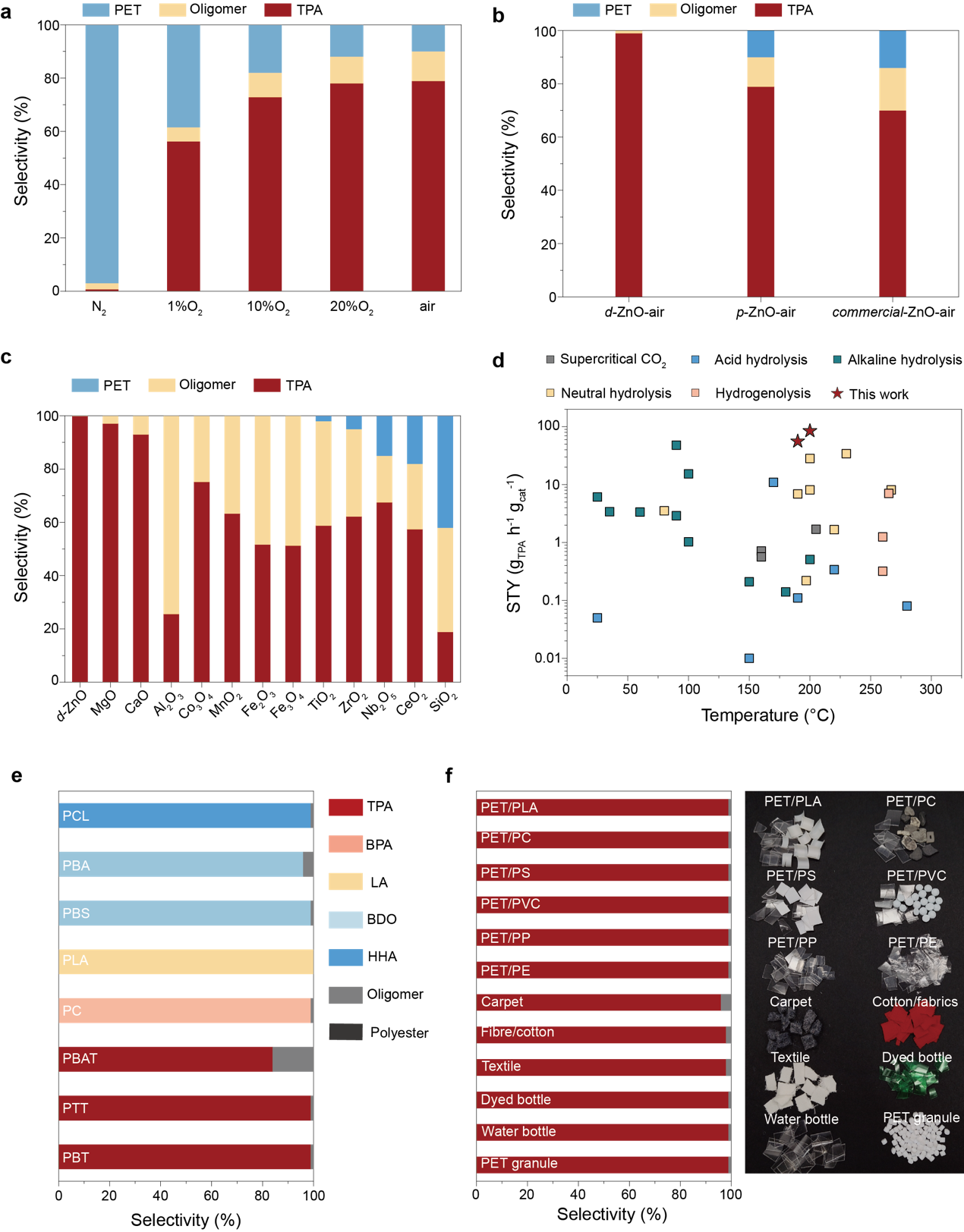 图3.缺陷氧化锌催化聚对苯二甲酸乙二醇酯和实际聚酯废物的解聚。(a)不同反应条件下催化水解PET的产物选择性。条件:PET (1.0 g),p-ZnO (10 mg),N2/O2(1/0, 100/1, 10/1, 5/1, v/v, 0.1 MPa)或空气(0.1 MPa),H2O (8 mL),190°C。(b, c)不同催化剂下催化水解PET的产物选择性。条件:PET (1.0 g),催化剂(10 mg),空气(0.1 MPa),H2O (8 mL),190°C。(d)缺陷氧化锌与其他催化剂用于PET水解的活性比较。其他催化剂的活性值根据文献报道的催化剂用量计算。(e)聚酯废物水解中的产物选择性。条件:聚酯废物(PBT, PTT, PBAT, PBS, PBA, PCL, 1.0 g),d-ZnO (10 mg),H2O (8 mL),190°C,6小时。聚酯废物(PLA, PC, 1.0 g),d-ZnO (10 mg),H₂O (8 mL),170°C,6小时。HHA: 6-羟基己酸;BPA:双酚A;LA:乳酸;BDO: 1,4-丁二醇。(f)混合聚酯废物水解的照片和产物选择性。条件:聚酯废物(1.0 g),d-ZnO (10 mg),H2O (8 mL),190°C,6小时。