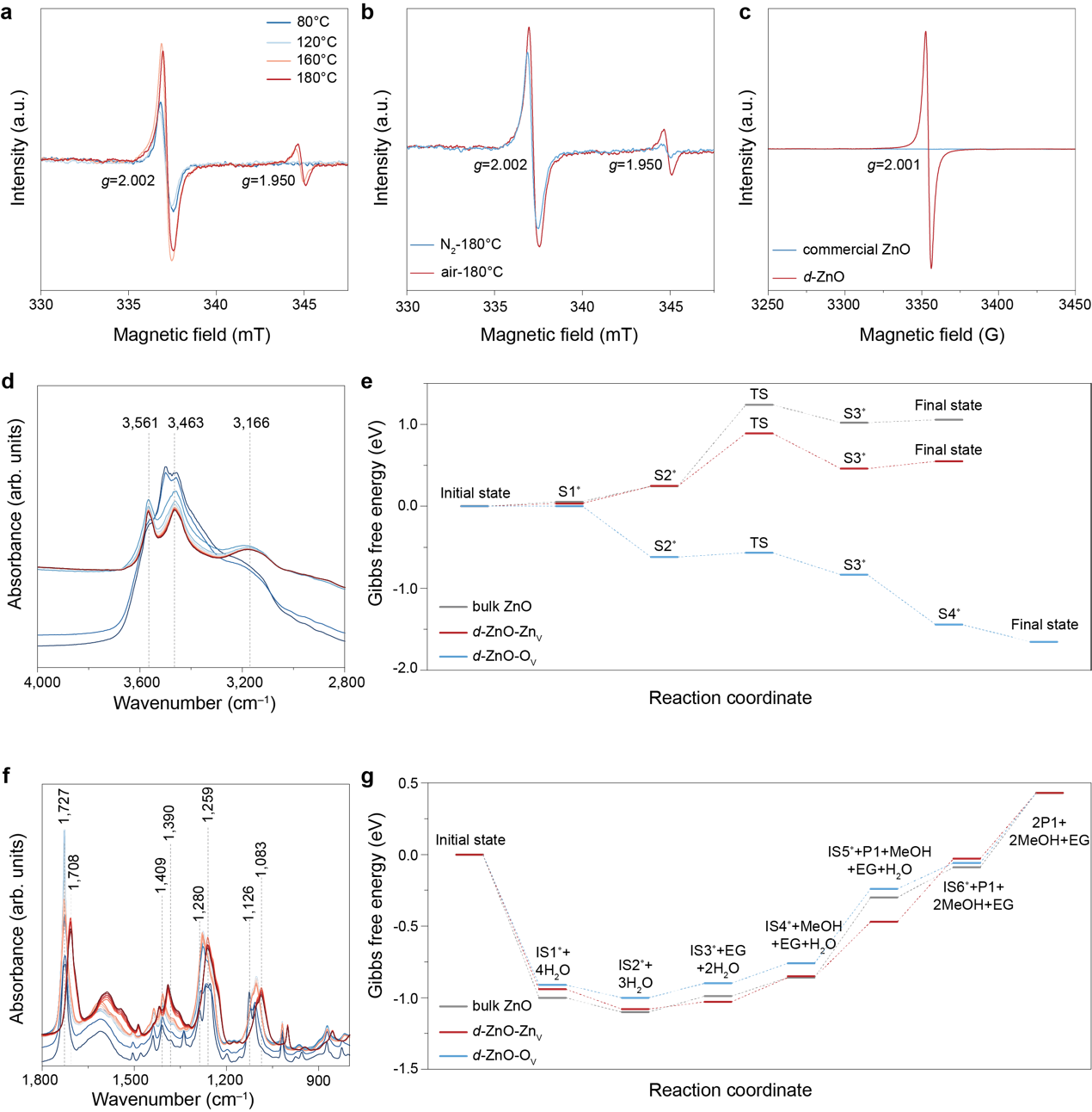 图4.缺陷氧化催化PET解聚的机理研究。(a)空气气氛下不同温度中缺陷氧化锌的电子自旋共振谱图。(b) 180°C下N2和空气气氛中缺陷氧化锌的电子自旋共振谱图。(c) 100 K下商业氧化锌和缺陷氧化锌的低温电子顺磁共振谱图。(d)空气气氛下H2O到H2O过程的原位衰减全反射红外光谱。(e)原始氧化锌、缺陷氧化锌-锌空位和缺陷氧化锌-氧空位上H2O转化为H2O的自由能谱图。(f)空气气氛下H2O中Mode解聚的原位高温红外光谱。(g)原始氧化锌、缺陷氧化锌-锌空位和缺陷氧化锌-氧空位上Mode和EG的自由能谱图。