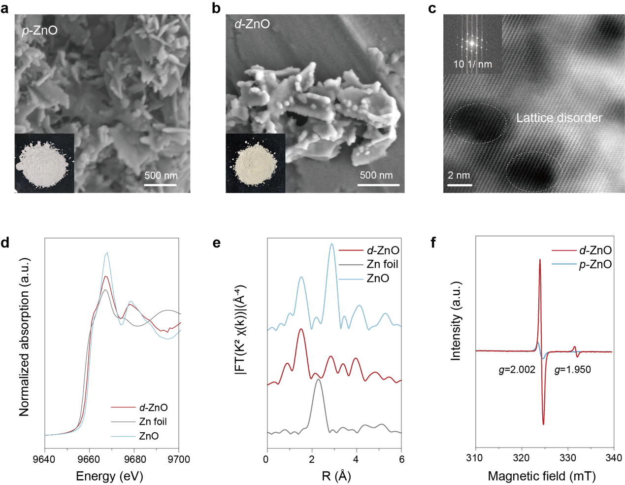 图2.催化剂的结构表征。(a, b)原始氧化锌和缺陷氧化锌结构的扫描电子显微镜图像。(c)缺陷氧化锌的球差校正扫描透射电子显微镜图像。(d)氧化锌、锌箔和缺陷氧化锌的归一化X射线吸收近边结构光谱。(e)氧化锌、锌箔和缺陷氧化锌的归一化傅里叶变换扩展X射线吸收精细结构光谱。(f)原始氧化锌和缺陷氧化锌结构的电子自旋共振曲线。