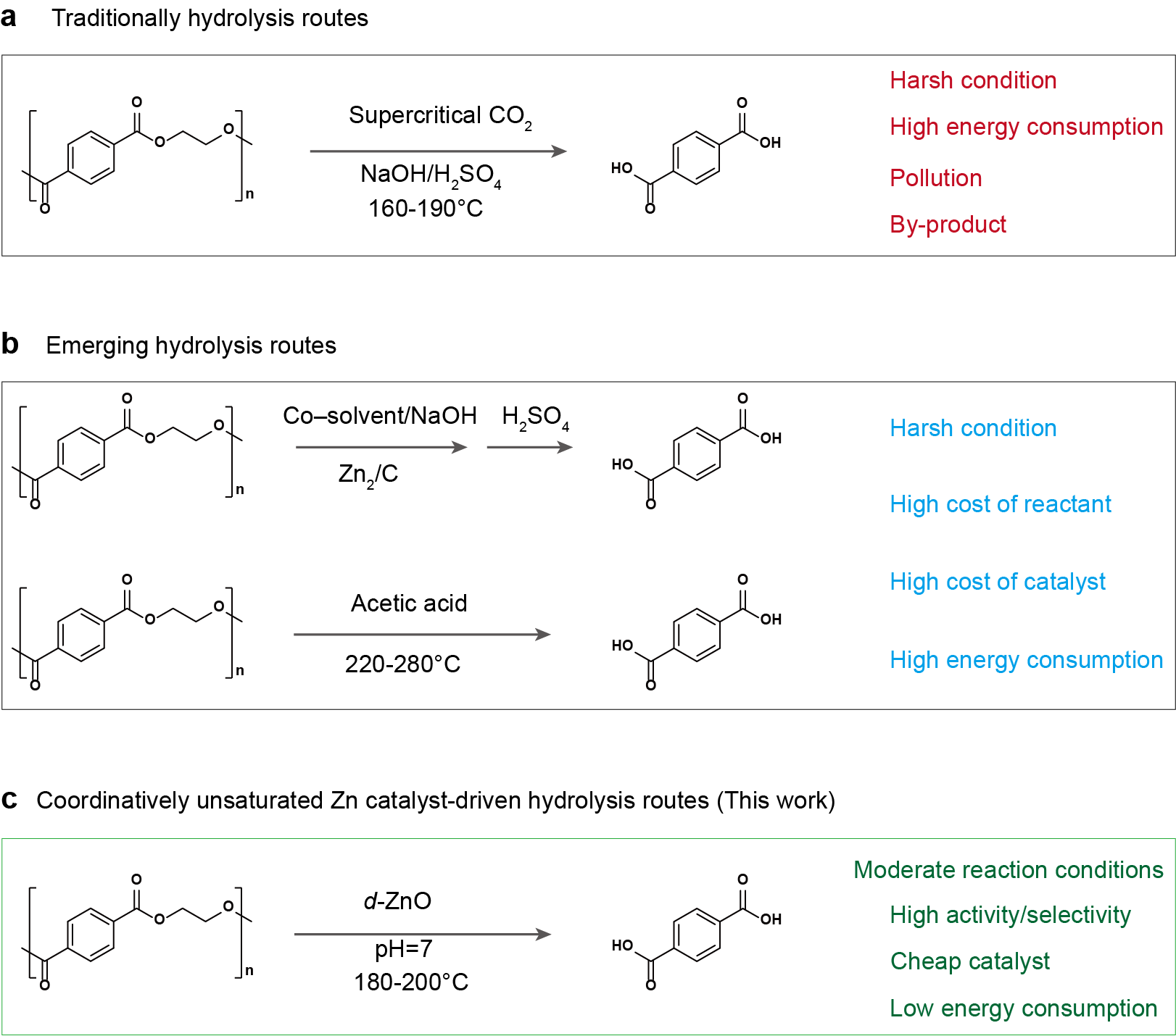 图1.聚酯化学回收路线对比。(a)传统水解路线和(b)新兴水解路线。(c)本工作中的不饱和配位锌催化剂驱动的水解路线。