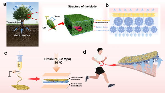 研究者提出了一种基于植物根系-叶片水分输运机制的仿生复合针织面料(CFP),该面料通过构建超细纤维网络与Janus不对称结构梯度,利用静电纺丝与热压粘合技术形成贯通的多孔网络,通过拉普拉斯压差强化毛细驱动力,在减少汗液反渗的同时有效提高普通针织导湿面料的水分传输能力。