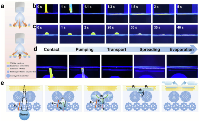 传输过程主要是纤维层间的孔隙梯度之间的相互作用,可以产生毛细驱动力(FW)和差动毛细效应的附加压差(∆P),可具体拆分为五个阶段:接触、抽吸、传输、扩散、蒸发。具体机制如图3.e所示。
