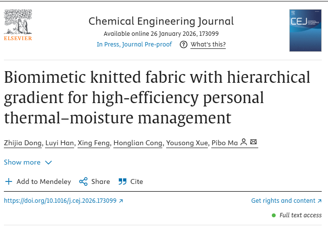 近日,我院马丕波教授和董智佳副教授团队在期刊《Chemical Engineering Journal》上,发表了最新研究成果“Biomimetic knitted fabric with hierarchical gradient for high-efficiency personal thermal–moisture management”。