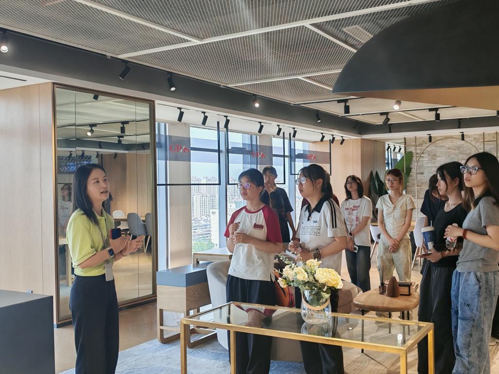师生深入企业业务展厅实地调研,外贸面料创新展区陈列的功能性防水面料、透气透湿牛仔布等,展现了纺织科技与国际时尚的深度融合;家居纺织品创意空间通过艾草抗菌床品、提花织造工艺窗帘等展品,直观呈现“纺织+生活”的创新应用场景。同学们边参观边记录,围绕“传统织造工艺数字化升级”“天然纤维材料商业化应用”等话题与企业技术人员展开热烈讨论。