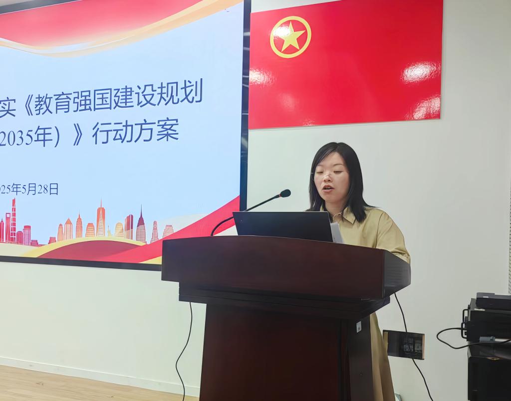 贯彻落实<教育强国建设规划纲要(2024-2035年)>行动方案》为主要内容,作教职工政治理论领学,她重点对立德树人铸魂行动、教育迭代跃升行动、学科筑峰扬优行动等8个专项行动、35个重点任务进行了详细解读。最后强调,全体教职工要深刻理解教育强国的科学内涵,认真对标行动方案,以钉钉子精神狠抓落实,努力成为学校落实教育强国建设“蓝图”转化为“实景图”行动的中坚力量。