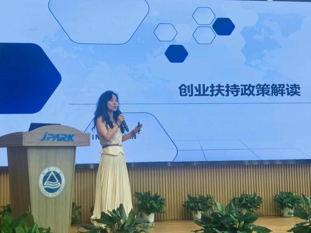 石玲琦向在场同学概述了园区的基本概况及入驻流程,重点解读了园区在促进高校成果转化、培育创新人才、打造双创特色活动以及孵化科技型企业等方面的具体措施和显著成果。此外,她还系统阐述了滨湖区针对大学生创业群体推出的“0成本”创业扶持计划,该政策从场地租金补贴、创业资金补助、税费减免等多个维度提供全方位支持,为同学们勾勒出清晰的创业政策图景,使大家深刻体会到政府部门对大学生创新创业的高度重视与实质帮扶。