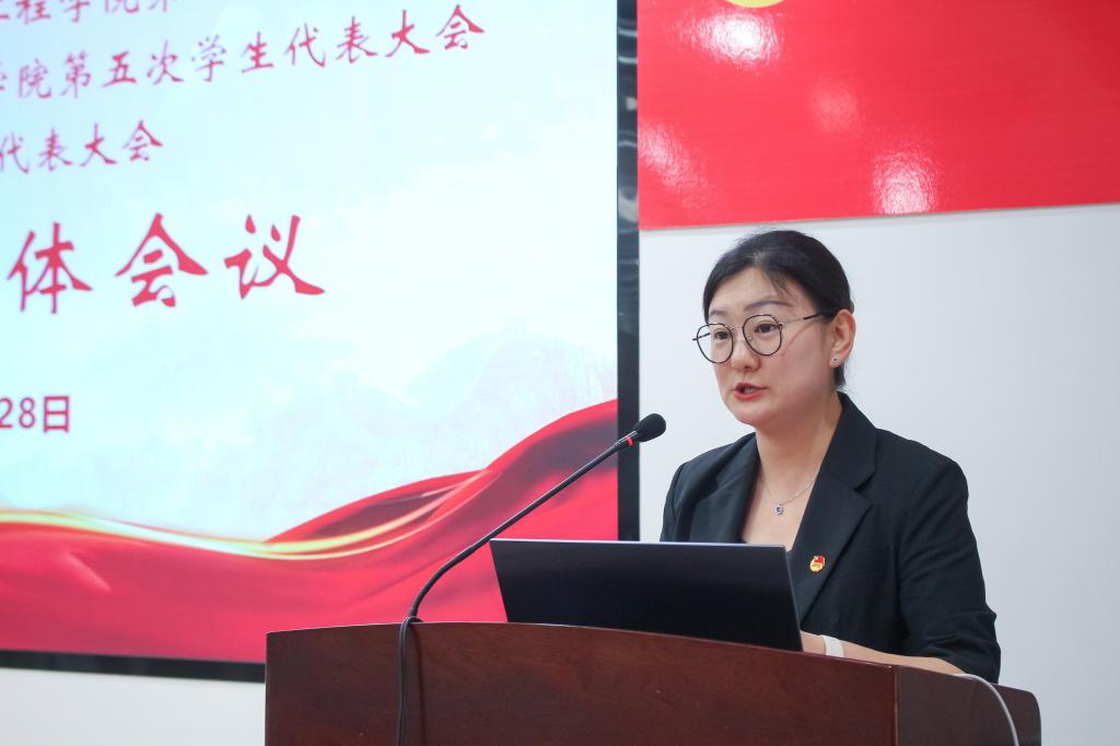 张菁燕代表学院党委对大会召开表示热烈祝贺,张菁燕从思想建设、科创育人、实践服务、校园文化四个方面,对学院往年工作进行总结,肯定了学院团学工作及学生工作的成绩,并鼓励广大代表强化政治引领,筑牢信仰根基,勇担时代使命,擦亮青春勋章,以青春之我、奋斗之我,投身于纺织事业的创新发展和美丽中国的建设中。