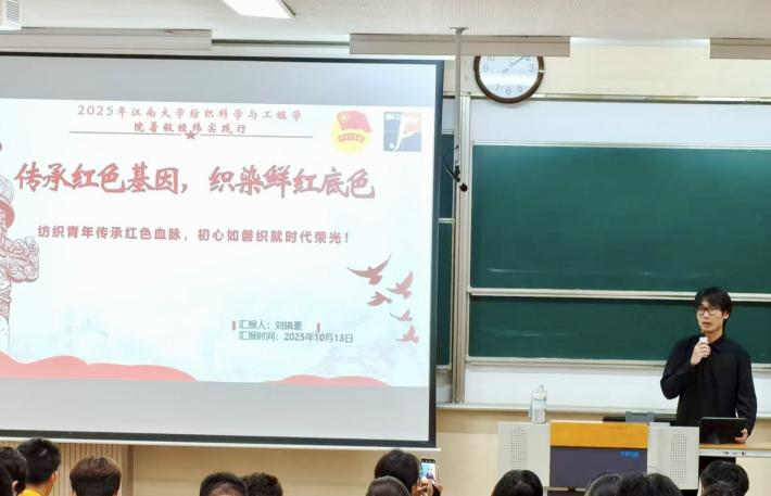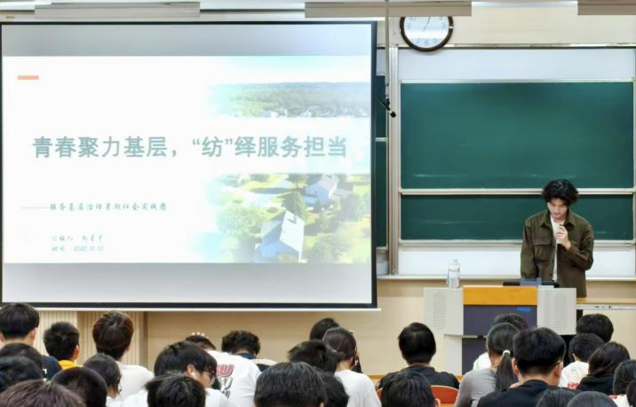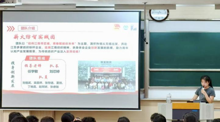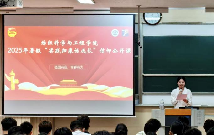 在本次暑假社会实践中,各团队围绕不同主题开展了一系列紧扣时代主题,内容丰富形式多样的社会实践活动。体悟大思政课,寻“纺”领袖足迹政务实践团深入基层一线,践行“三下乡”使命,在行走的“大思政课”中感悟思想伟力。薪火纺“智”实践团以“行走的思政课”为载体,深入纺织企业,于产业一线探索新质生产力。“经纬安疆,织梦固边”实践团以实地考察探寻纺织价值,用社区宣讲传播安全理念,深入挖掘纺织行业在国家安全中的重要作用。“鼋起江南,梦赴川西”实践团奔赴四川泸定,与各族孩子共同打造难忘夏令营,同时深入开展红色调研,用青春书写担当。聚力青春有为,深“纺”基层服务实践团返乡投身基层治理,为基层治理提效注入青春纺织动能。“纺工传承红色薪”传承红色基因实践团开展故事宣讲、探访红色地标、整理党史资料,用青年视角解读信仰的力量。“经纬织文脉,锦绣展自信”实践团亲历多元文化,体悟中华优秀传统文化之韵。“文心筑梦,文脉薪传”实践团探寻多地传统文化,用行动践行传承。八位实践团的团队代表依次登台分享他们的实践故事,用鲜活案例展现知行合一的青春力量。