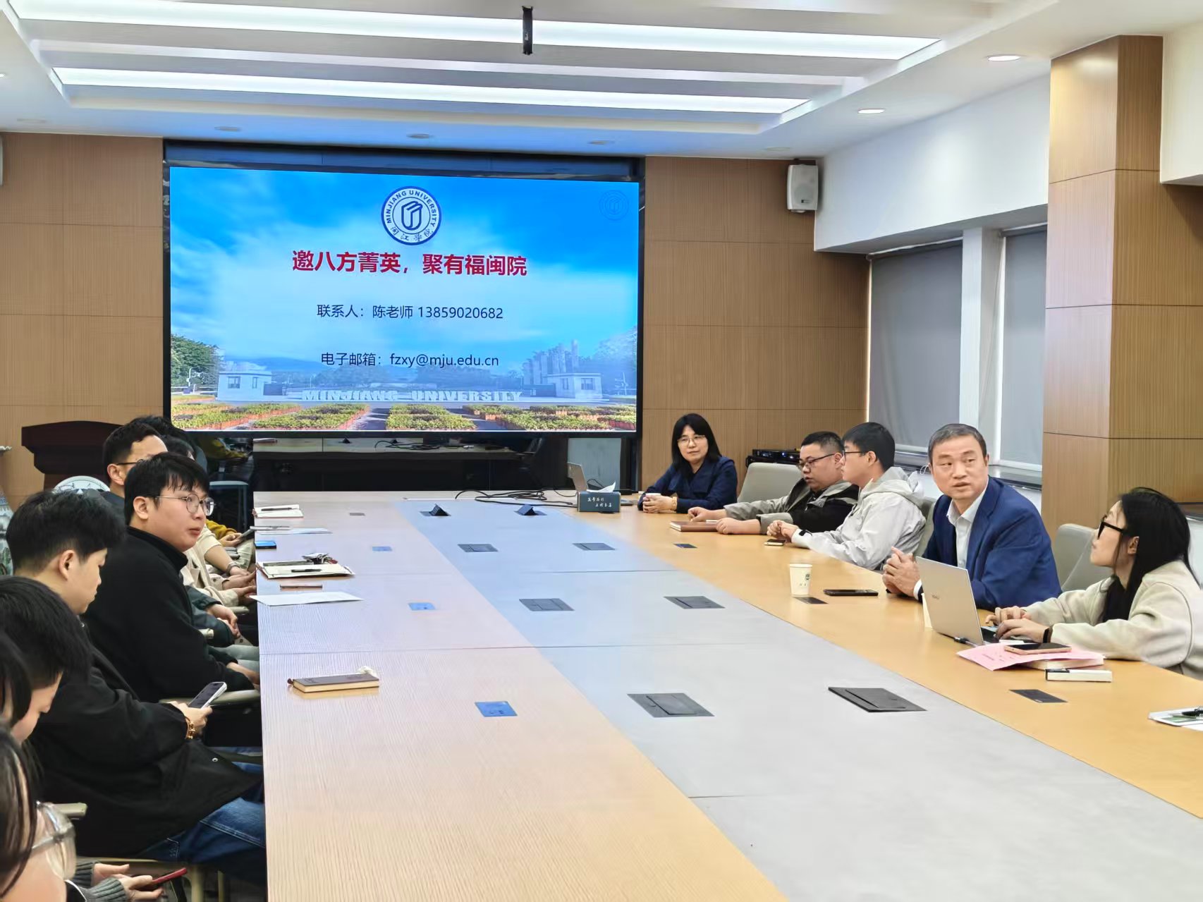的优秀博士毕业生能够选择闽江学院作为事业起航和腾飞之地。在互动交流环节中,与会博士生们围绕专业发展方向、科研团队融入、教学科研考核、生活安置细节等问题进行了踊跃提问,现场气氛活跃。