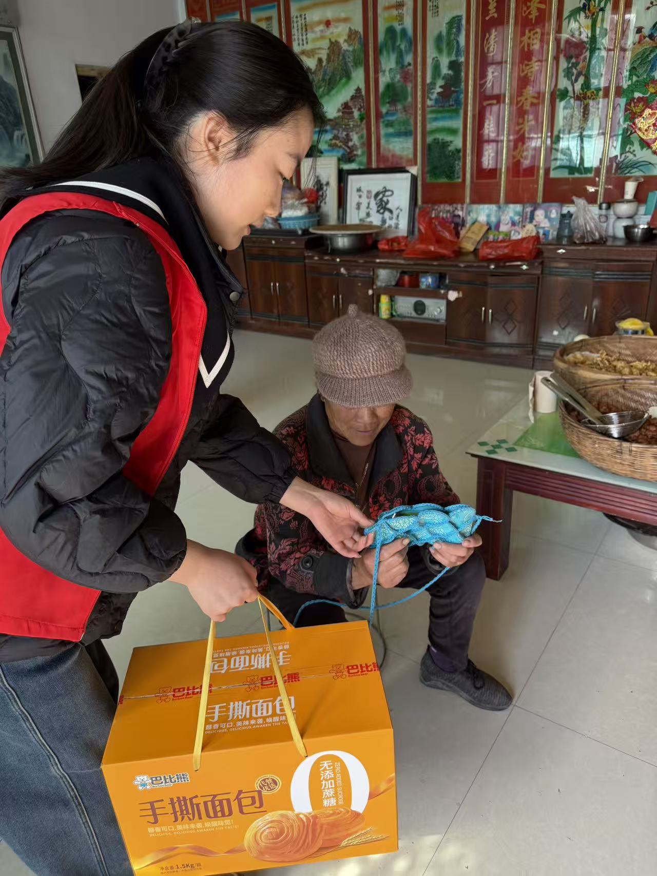 李冉同学深入家乡偏远村落,投身志愿服务,对接村委会帮扶七旬独居老人,清理院落、相伴摘菜。同时结合纺织特色,亲手编织布包赠予老人并讲解编织方法,以纺织温情抚慰乡村孤老。她表示,乡村中存在大量孤寡老人和留守儿童,纺织的力量能够有效抚慰他们的孤独感、提升幸福感,同时呼吁更多社会力量加入乡村振兴的队伍。